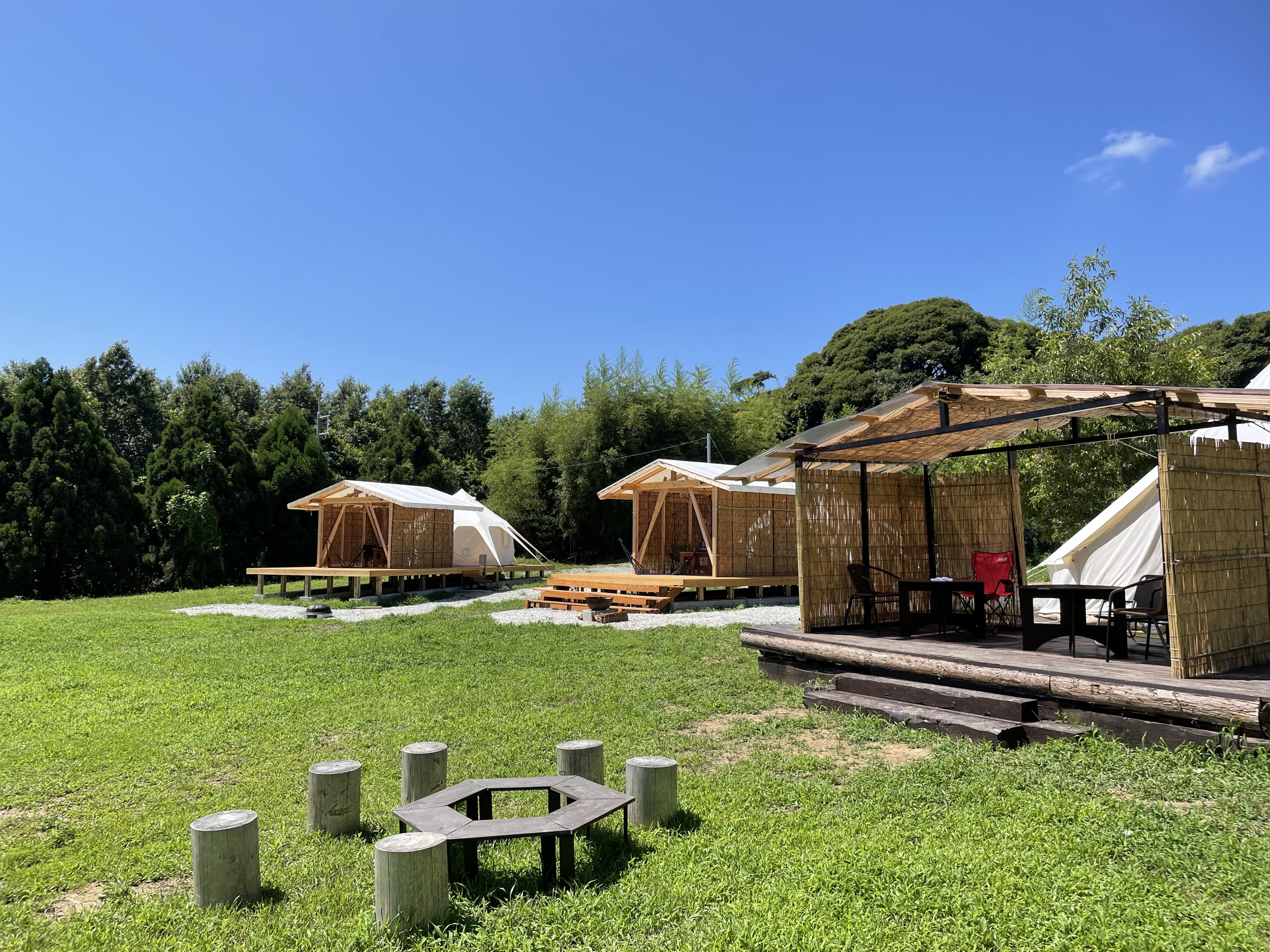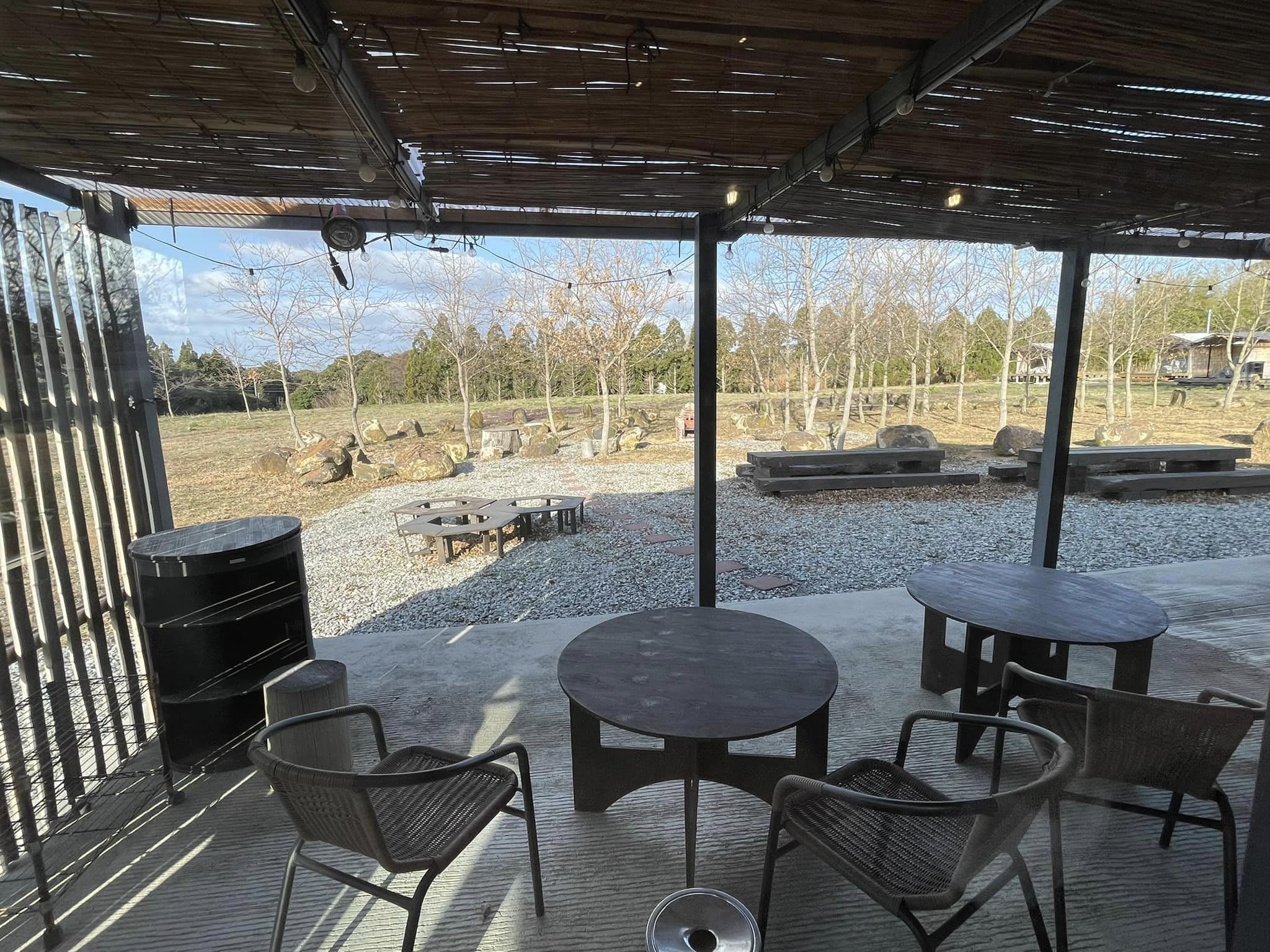 広々としたウッドデッキには屋根付きのテラス席があり、ガーデンパーティや目の前に広がる緑の絨毯や青空に白い雲など、開放感にあふれる空間を楽しんでいただけるよう造られています。またウッドデッキの側には焚き火を楽しんでいただけるよう、焚き火台も準備しています。