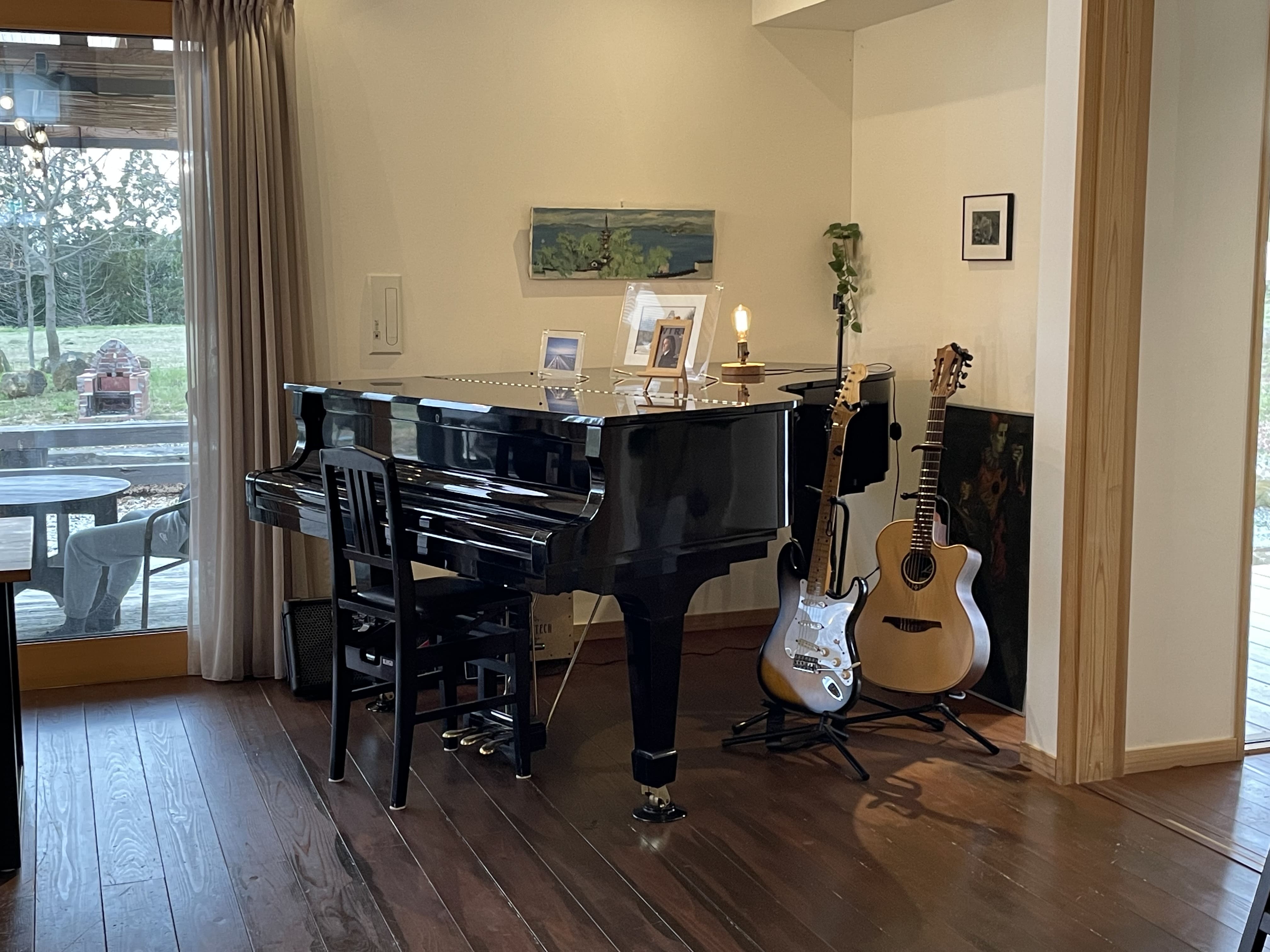 ダークブラウンと白のコントラストが落ち着いたくつろぎを演出しています。窓から見えるクヌギの林が癒しを感じさせます。